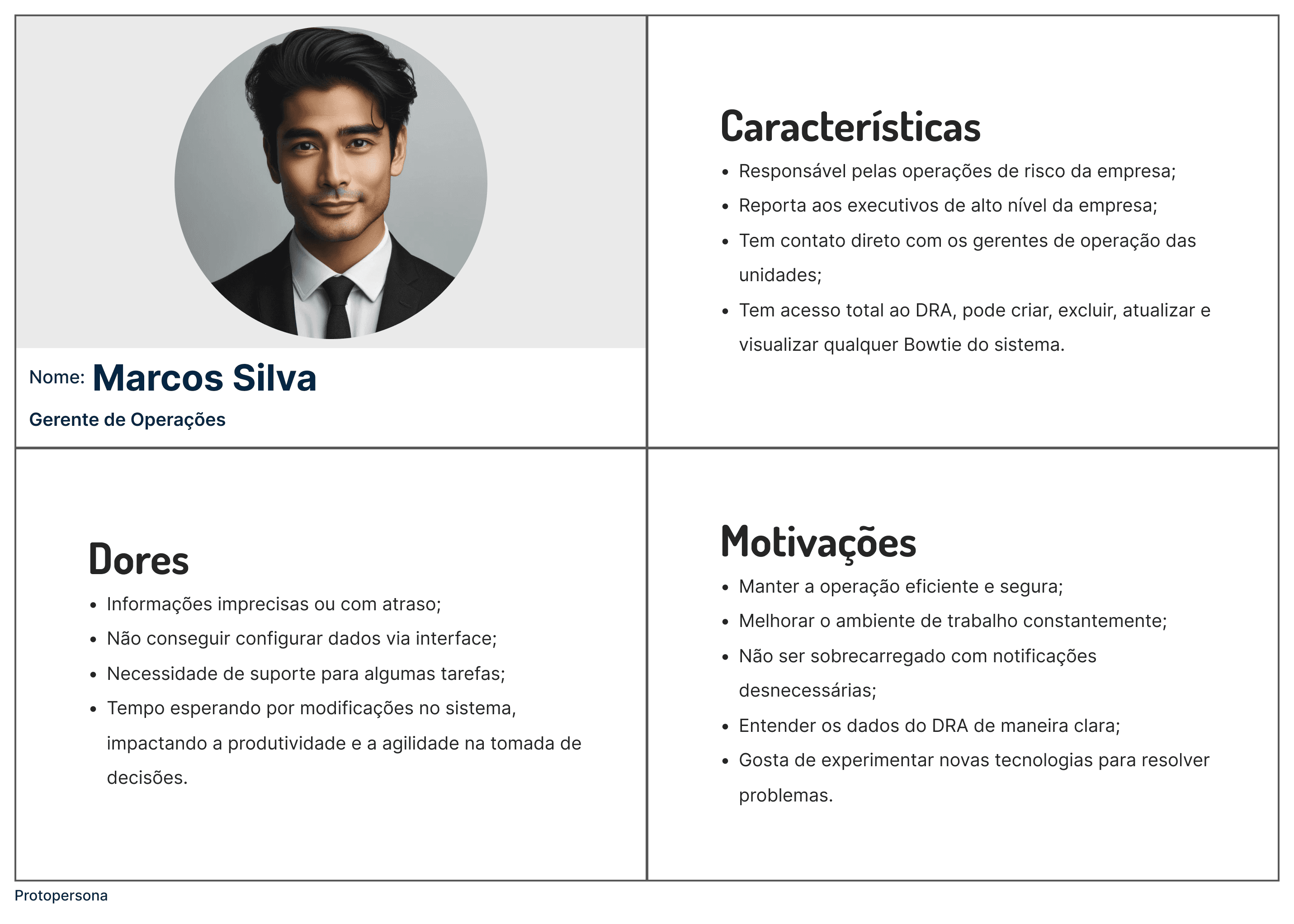 O usuário que utiliza a interface de Status de barreira é quem faz toda a configuração do bowtie na plataforma, ele geralmente tem um cargo de gerência e necessita de agilidade na execução de atividades do dia a dia.