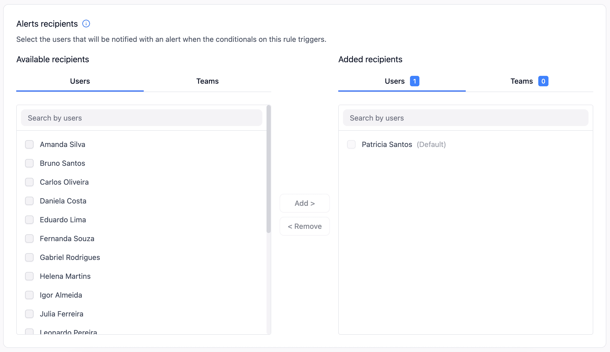 Na solução antiga, só era possível selecionar destinatários por perspectiva (janela de informação filtrada para um time), o que impedia a personalização para usuários individuais. Por não ser o principal fluxo a ser testado, na primeira versão do redesign os alertas eram enviados apenas ao criador da regra.
