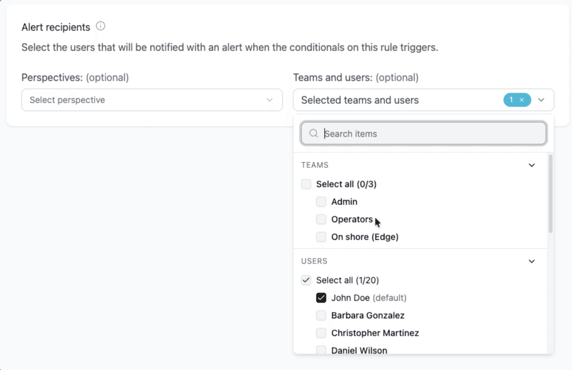 O componente avaliado foi o de seleção de destinatários de alertas (Alert Recipients), introduzido no redesign para permitir maior granularidade na definição de quem recebe os alertas. A plataforma possui três níveis de permissionamento: usuários individuais, times e perspectivas.