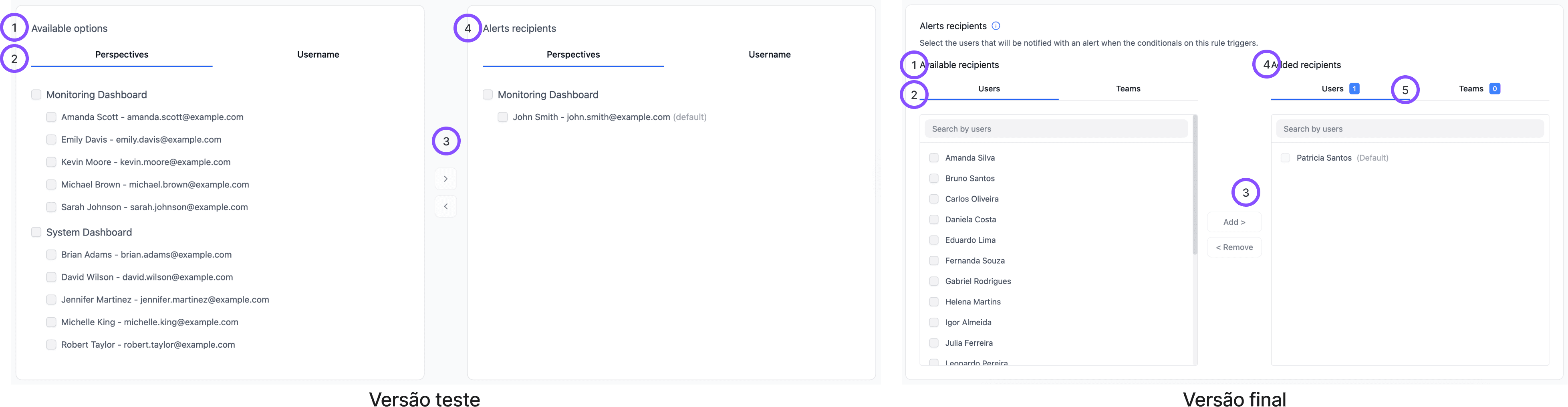 A partir do momento que fomos incluir o componente para seleção de destinatários, tentamos incluir as três camadas de permissionamento (Usuários, Times e Perspectivas), e o resultado foi baixa compreensão e alto índice de erros. Por conta disso, foi necessário realizar outra rodada de testes apenas com o componente de destinatários.